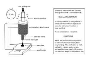 In this test, notice that the polymer type must first be known; the scope of MFI is to fine-tune only for variations within a specific polymer. A proper supplier of a polymer pellet (sometimes called resin, not to be confused with the liquid resin) will have data on at least two things : MFI and Melt Temperature. For the experienced operator, these two parameters will suffice to begin processing by setting up a conservative screw speed (extrusion speed), and heater temperature(s).